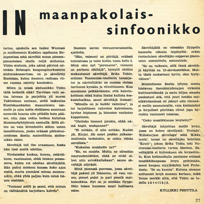 Kukapa ei koulussa aikanaan opittua vielä sen verran olisi mielessään saanut pysymään, että Peipsen taikka Peipsenjärvenkin ainakin nimeltään muistaisi, tuon Eestin itärajalla olevan ison järven. Sen länsirannalla on Kallasten kalastajakylä, jossa kylässä syntyi ja kasvoi Eestin etevin sinfoonikko Eduard T u b i n, musiikkimies lapsuudesta asti. Isä oli "kalamees", "kaluri" ja peltomies, mutta myös soittomies kuten pikku Eduardin velikin. Kun veli vuonna 1912 kuoli, peri Eduard veljen pikkolohuilun, jota pienenä sikopaimenena pahaisna soitteli. Ja kun sitten saksalaiset ensimmäisen maailmansodan lopun levottomina aikoina möivät omaisuuttaan, osti isä Tubin jostakin moisiosta halvalla taffelipianon. Se oli suuri tapaus Eduardin elämässä, ja hiukan soittotaitoa ja nuotinlukutaitoa kun hänellä ennestään oli, oppi hän muutamassa päivässä sillä soittamaan. Mutta lapsuus ja nuoruus ei peltomiehen ja kalastajan kodissa kulunut vain soitellen, tuleva säveltäjä teki kotonansa samoja töitä kuin muutkin, pellolla ja järvellä. Kotimaassaan Tubin sitten ennätti suorittaa opettajatutkinnon ja samalla kertaa Tarton musiikkiopiston oppimäärän, olla monet vuodet maineikkaana kuoronjohtajana ja kapellimestarina, opiskella sen lisäksi Wienissä ja myöhemmin Kodályn oppilaana Budapestissa sekä säveltää muun pienempimuotoisen ohella neljä sinfoniaa. Viides sinfonia, joka näinä päivinä esitetään Helsingin kaupunginorkesterin sinfoniakonsertissa, on jo sävelletty Ruotsissa, kuten Suomen radiossa viime vuonna esitetty kuudeskin. Miten ja missä sinfoonikko Tubin tällä hetkellä elää? Tarvitsee vain astua laivaan ja purjehtia yli meren Tukholman rantaan, siellä laskeutua Kuninkaankadun maanalaisen asemalle ja ajaa uutta eteläiseen suuntaan menevää haaraa niin pitkälle kuin pääsee, niin jopa onkin hetken kuluttua Hammarbyhöjdenin asemalla. Siitä sitten on vain kivenheitto siihen uuteen lamellitaloon, jonka eräässä pikkuhuoneistossa Eestin maineikkain sinfoonikko elelee. Säveltäjä tuli itse avaamaan, koska hän tiesi meitä odottaa. Virolaiseksi kookas, komea, ystävällinen, vaatimaton, ehkä hiukan poissaoleva, kuten voi odottaa säveltäjältä. Hän puhui mieheni kanssa koko ajan eestiä, mutta ymmärsi minun suomeanikin, ehkä yhtä paljon kuin minä hänen eestiään.
